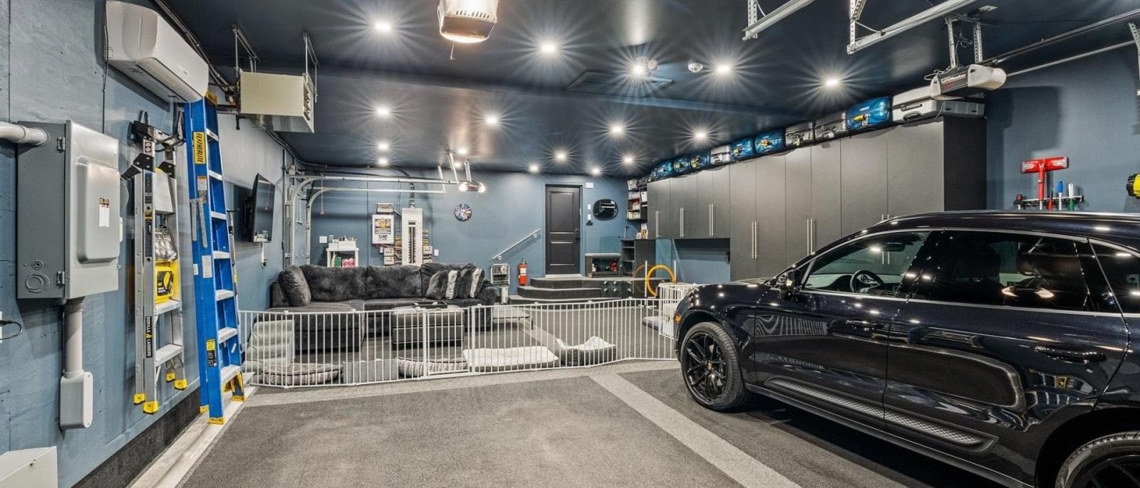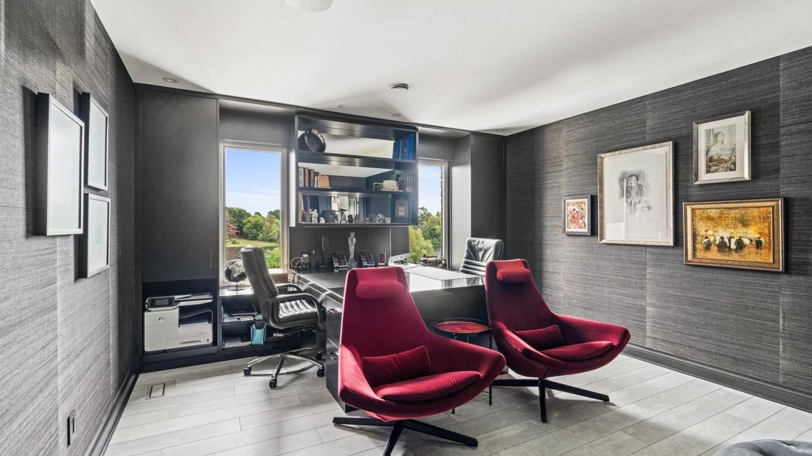 This striking living area showcases dramatic coffered ceilings with charcoal paneling and exposed beams, creating intimate gathering spaces within the open-concept design. The sophisticated wet bar with custom cabinetry makes entertaining effortless, while floor-to-ceiling windows frame verdant outdoor views and flood the space with natural light that dances across the hardwood floors throughout the day.